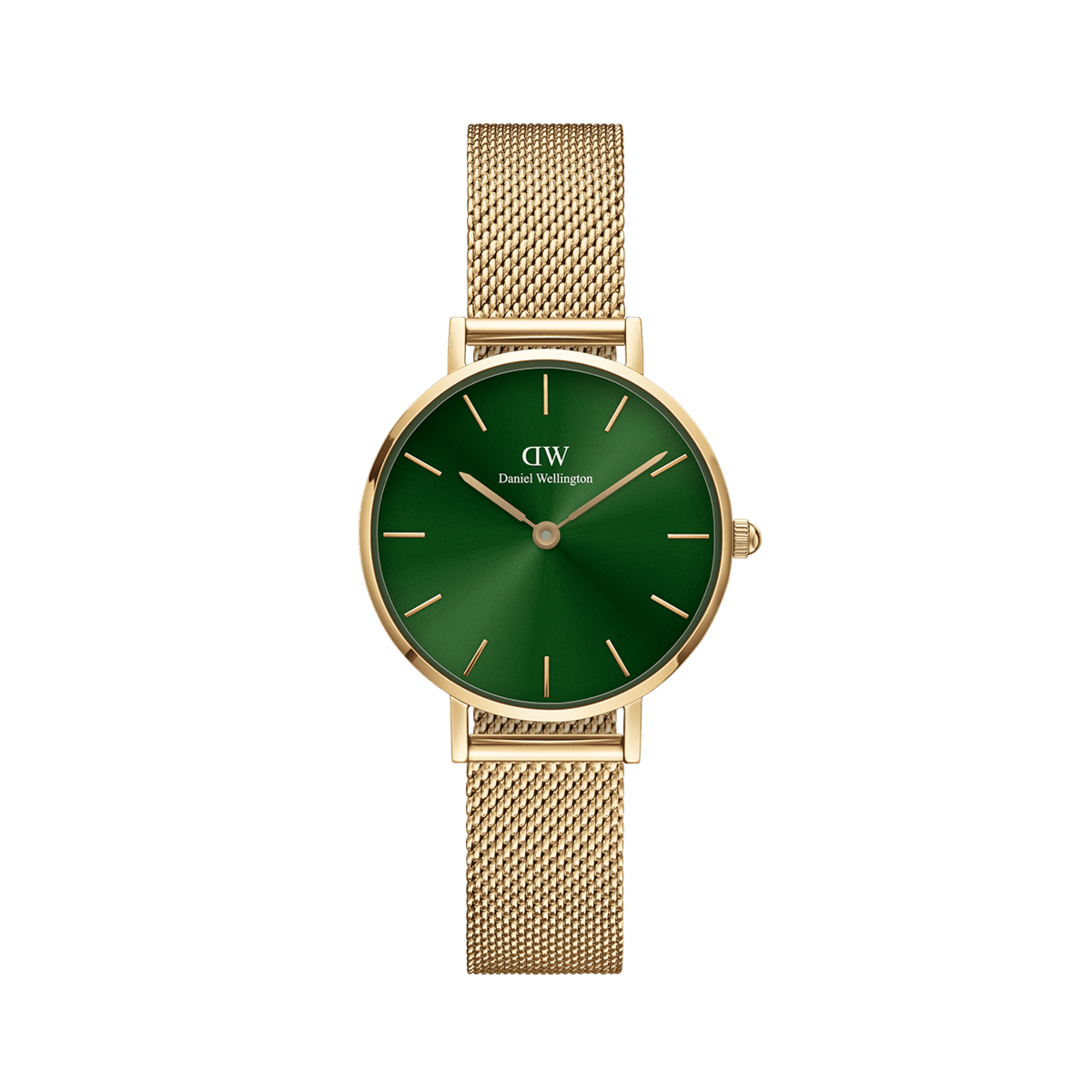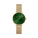 The Petite Emerald features a dark green dial with a sunray finish. A color that symbolizes balance, harmony, and good luck. Crafted with polished stainless steel, available with a refined gold plating. A bold timepiece that gives your look a unique touch.