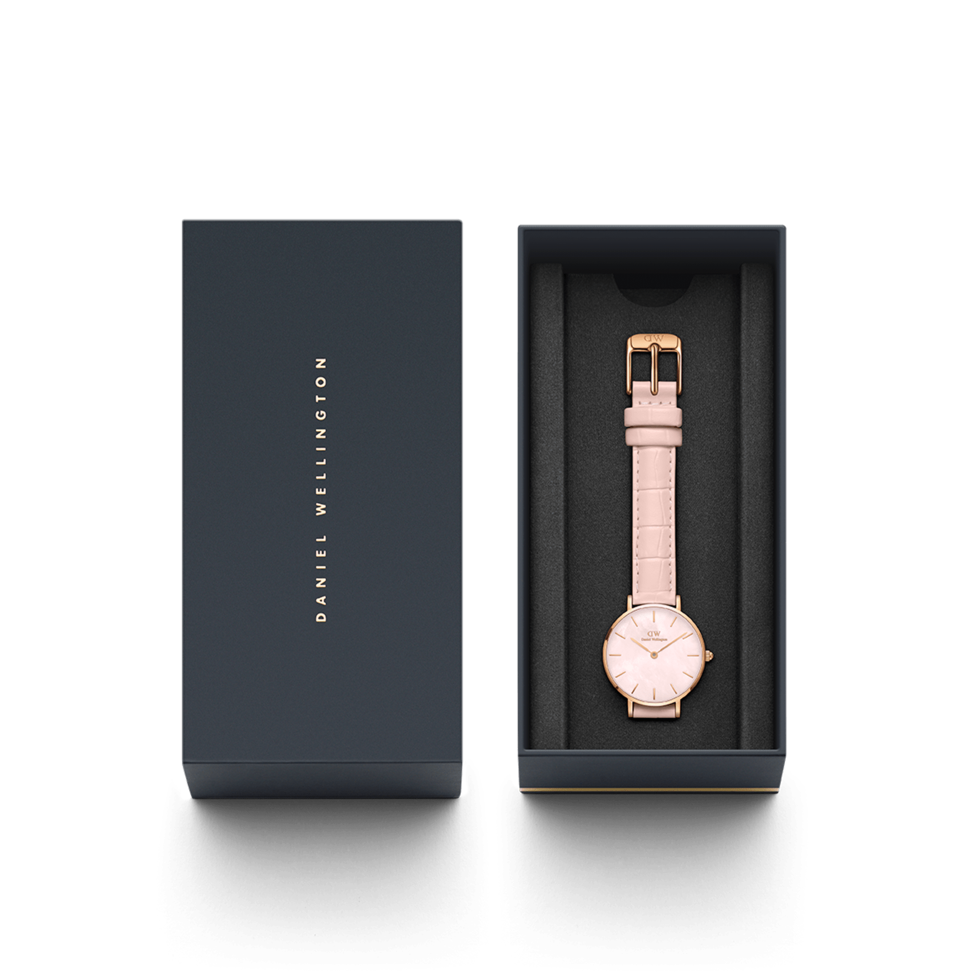 The Petite Rouge features a glistening pink mother-of-pearl dial. An everyday piece that breathes elegance. Known for its beautiful iridescence and one-of-a-kind nature, this new dial makes each timepiece unique and distinct. Complemented with a nude pink croc-pattern leather strap, crafted with stainless steel and plated with refined rose gold. This unique watch is perfect for you who like to add colorful accessories to your outfit.