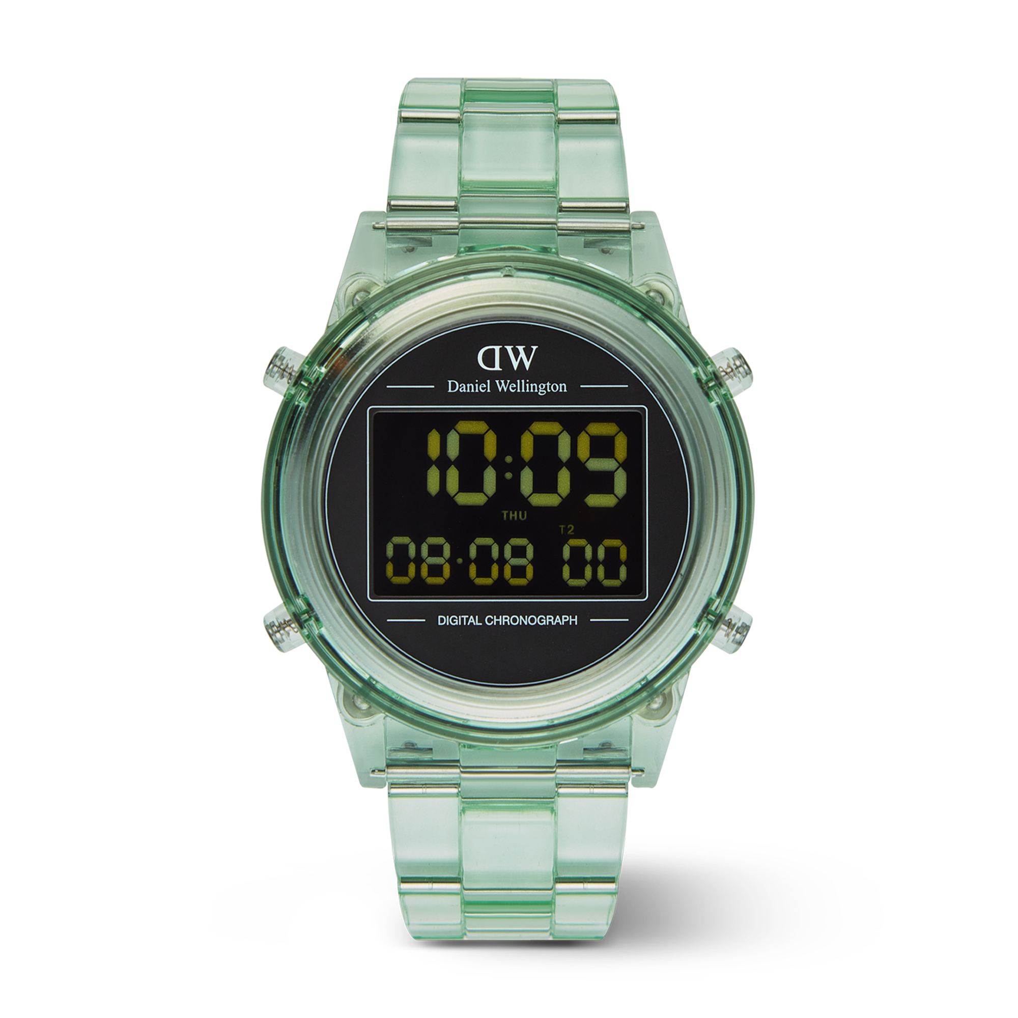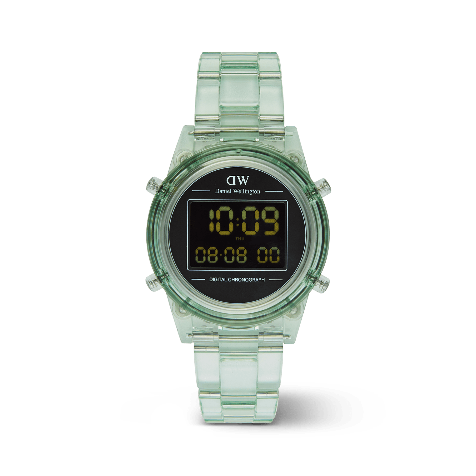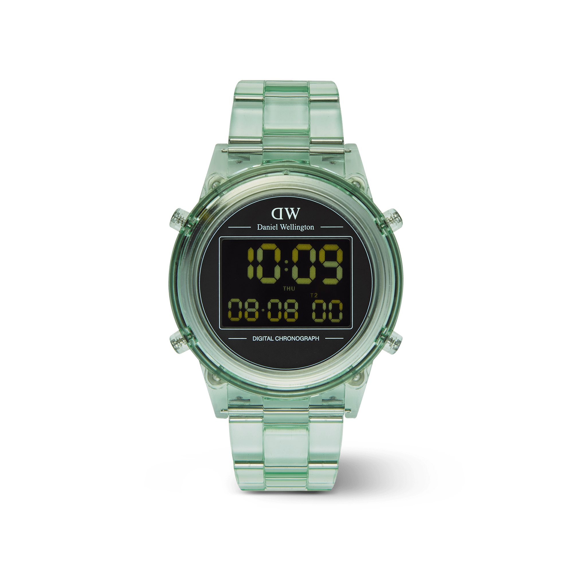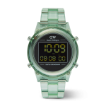 Introducing the Retro Digital Watch: a blast from the past with all the modern features you need. Crafted from transparent bio-based plastic in a cool tone color palette, this timepiece effortlessly blends throwback charm with contemporary materials for a truly distinct aesthetic. And while its silhouette takes inspiration from our renowned Iconic Link design, we’ve gone truly digital with 10-digit dual time display, auto calendar with a daily alarm and hourly chime, and chronograph function. This light green version is available in two sizes.