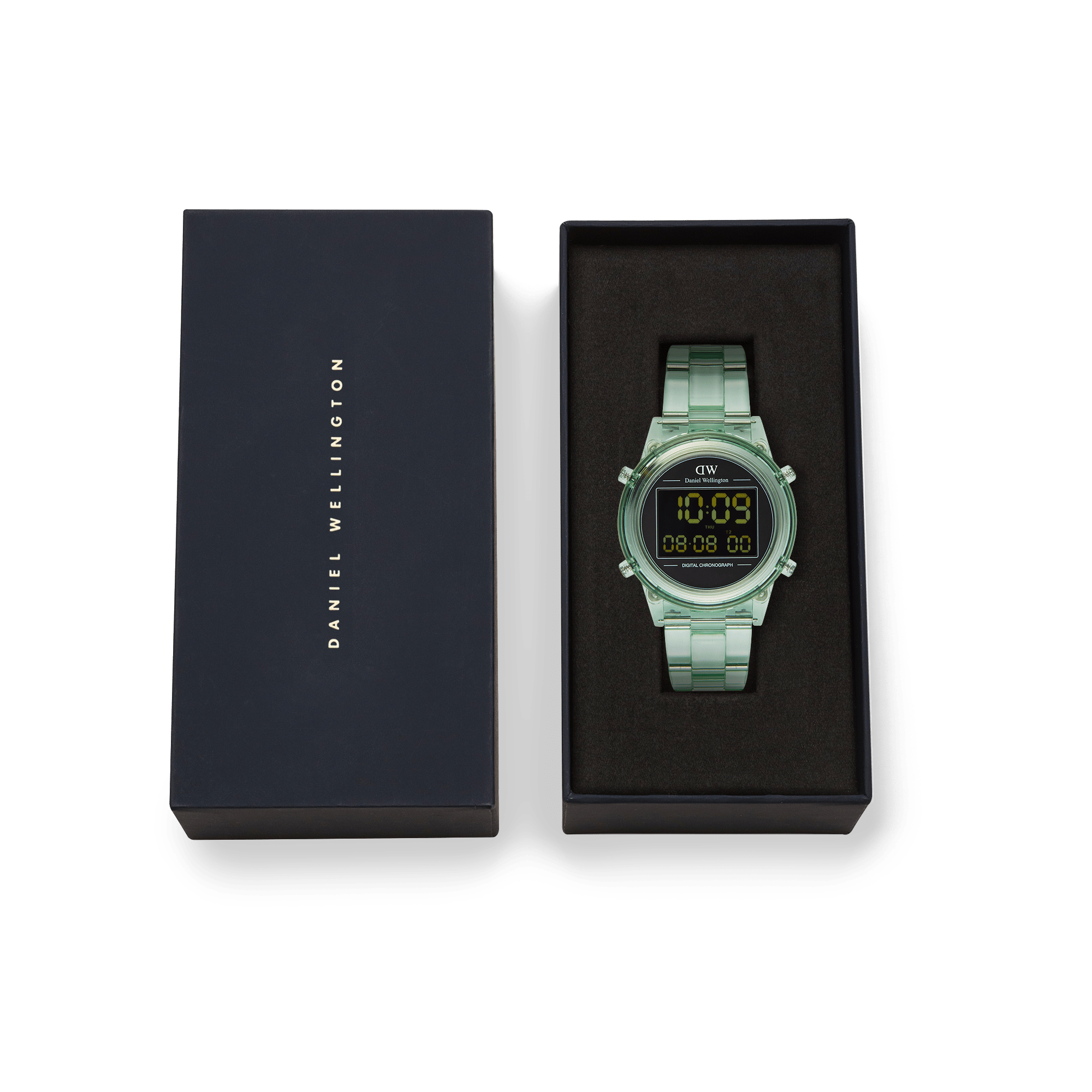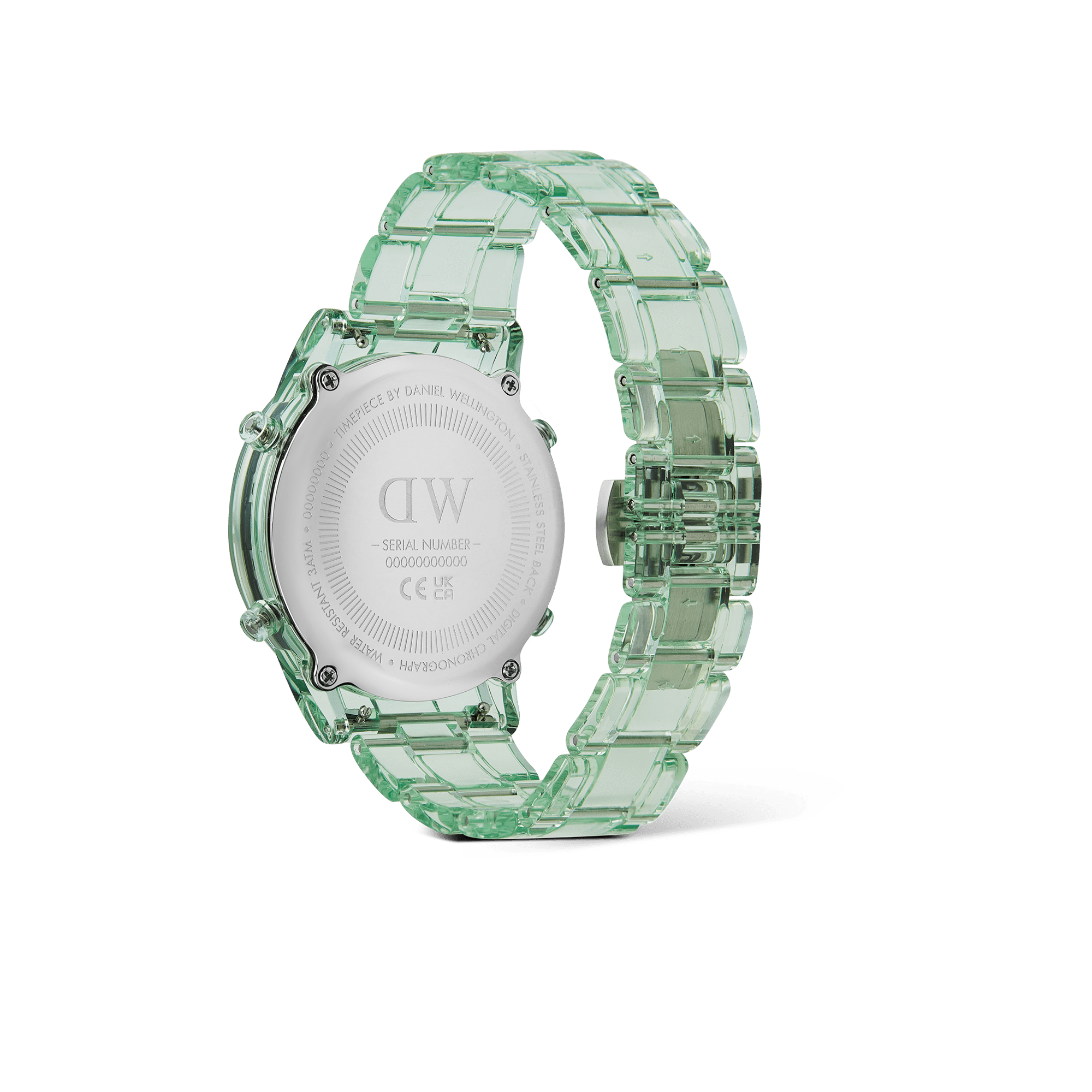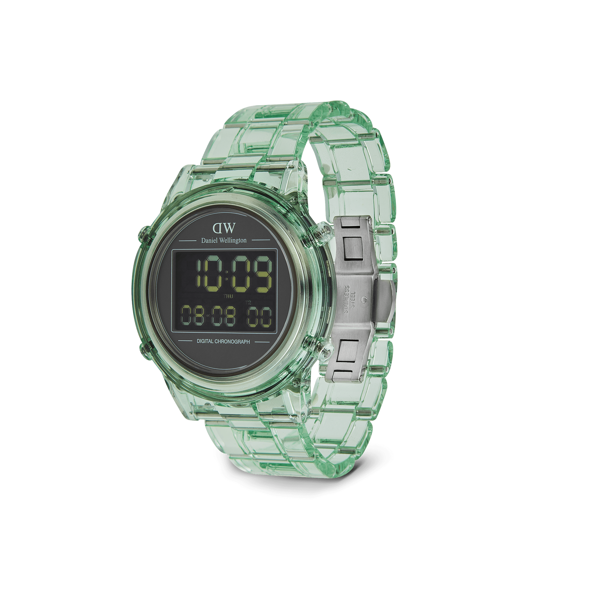 Introducing the Retro Digital Watch: a blast from the past with all the modern features you need. Crafted from transparent bio-based plastic in a cool tone color palette, this timepiece effortlessly blends throwback charm with contemporary materials for a truly distinct aesthetic. And while its silhouette takes inspiration from our renowned Iconic Link design, we’ve gone truly digital with 10-digit dual time display, auto calendar with a daily alarm and hourly chime, and chronograph function. This light green version is available in two sizes.